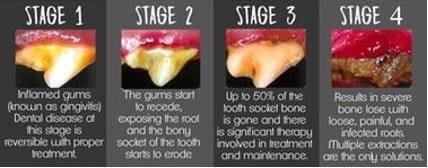The formation of plaque on teeth leads not only to calculus or tartar buildup but also to gingivitis. If left untreated, gingivitis can progress into more advanced periodontal disease. Studies have shown that late-stage dental disease and poor oral care increase the risk of kidney, heart, liver, and pulmonary disease. To learn more about dental disease, click HERE.